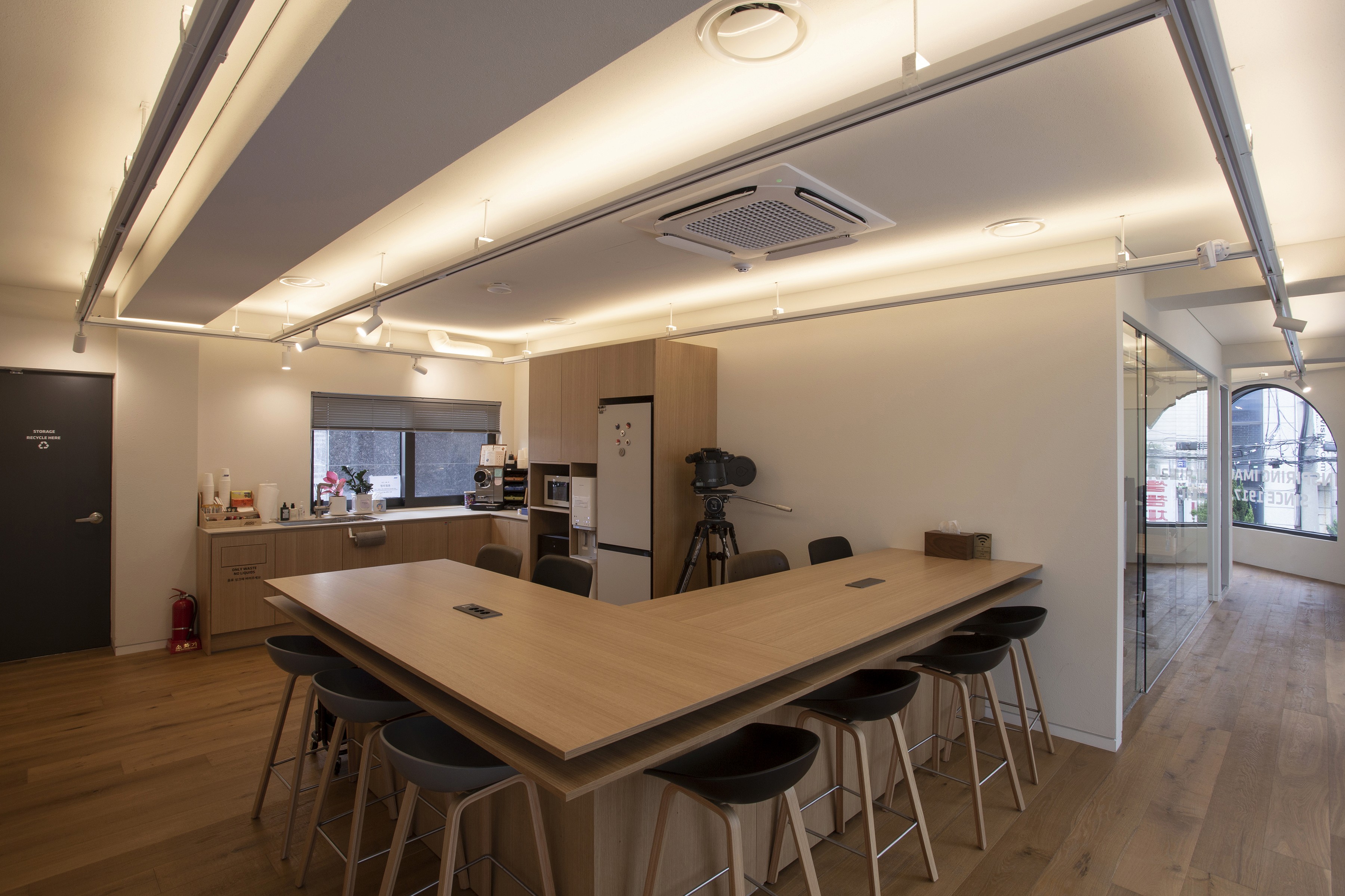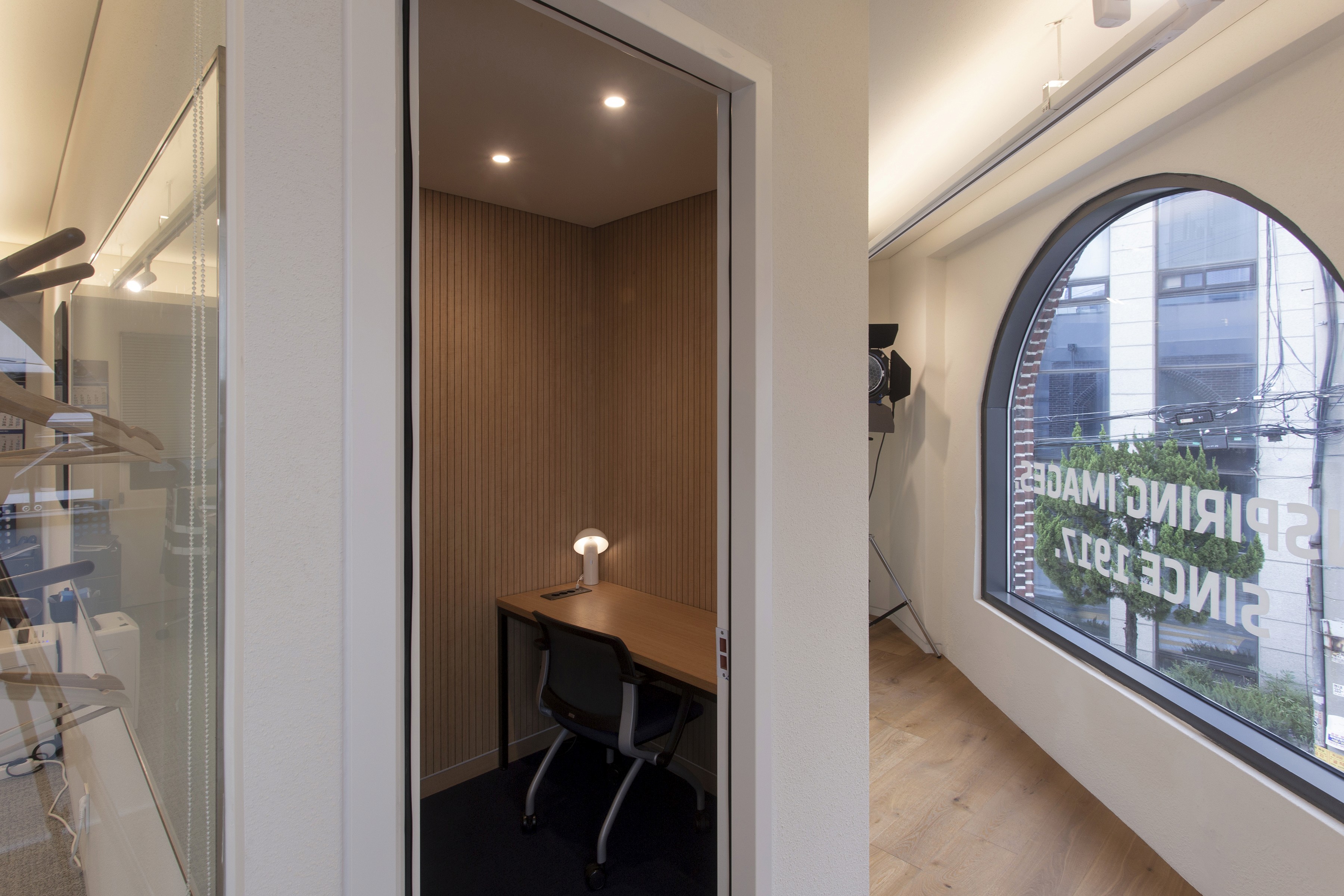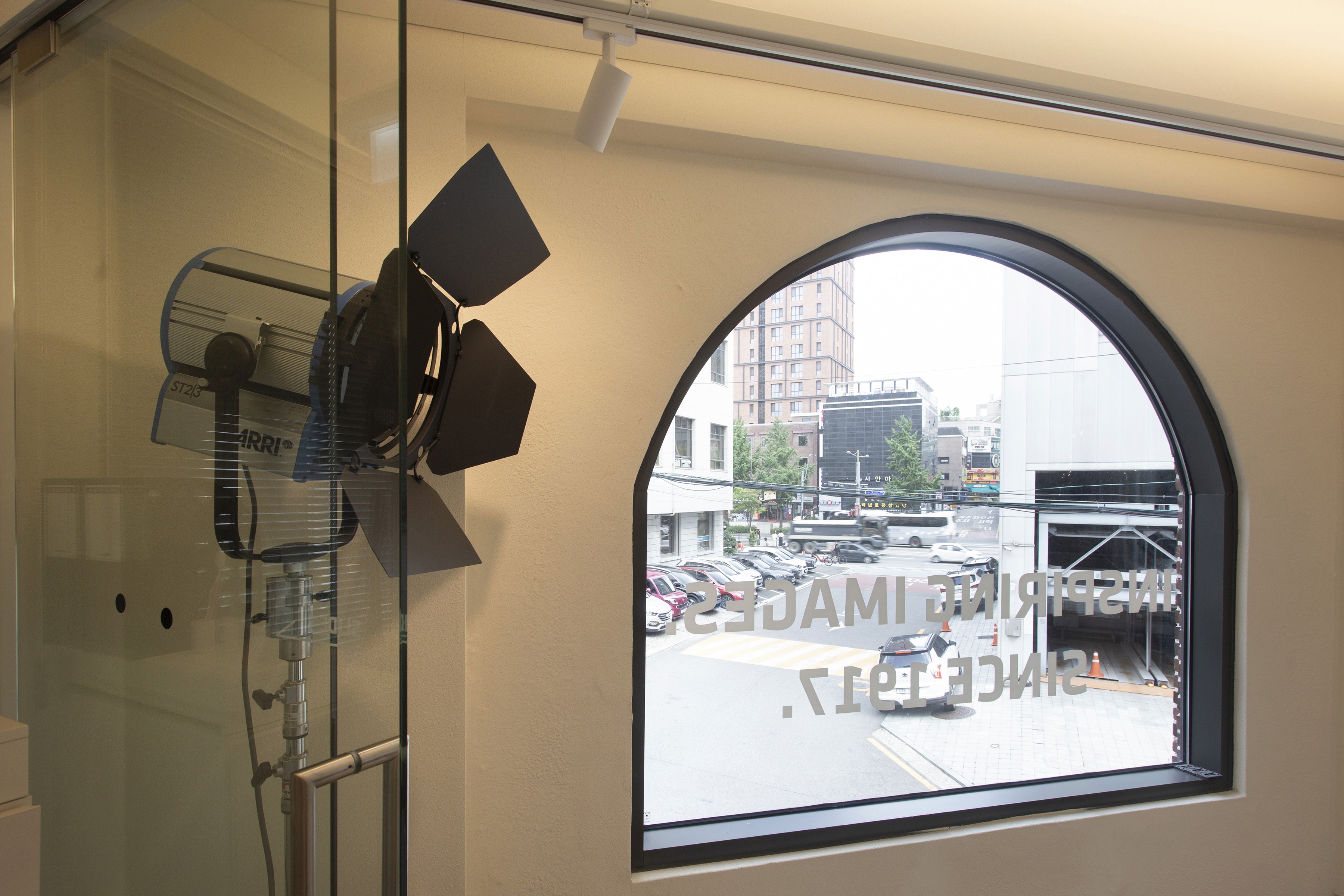 이러한 ARRI의 정체성과 비전이 공간에서도 드러나도록 디자인했다. 복도에 연속되는 아치 형태의 창 너머 풍경 위로 반투명한 사각 유리 프레임을 중첩해 새로운 이미지를 만들었다. 프레임은 ARRI가 만들어내는 이미지를 투영할 수 있는 스크린이 되며, 복도를 걸으며 마주하는 창의 반복을 하나의 시퀀스로 인식하도록 연출했다. 그 결과, 이동 자체가 새로운 이야기를 경험하는 장면이 되도록 했다.