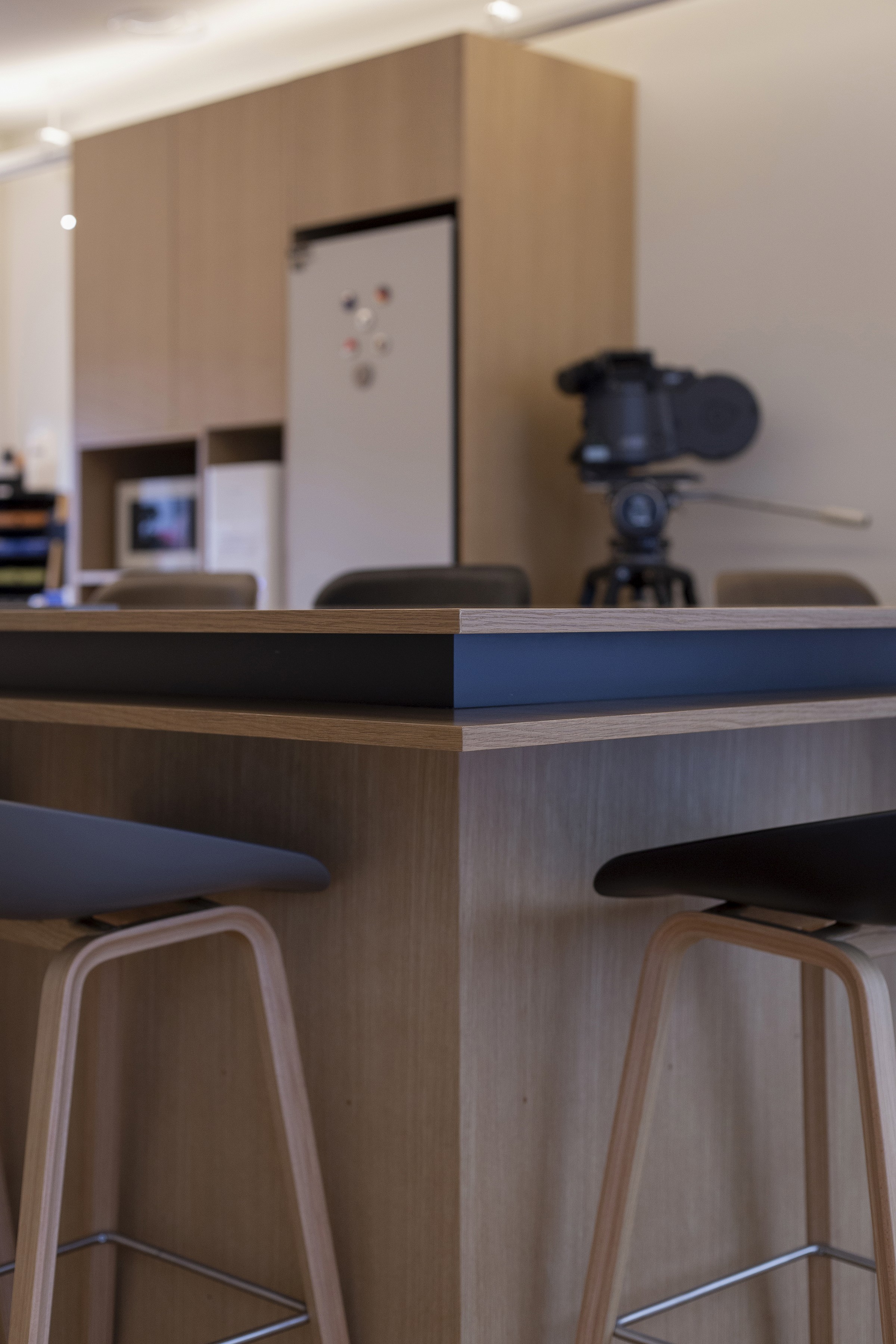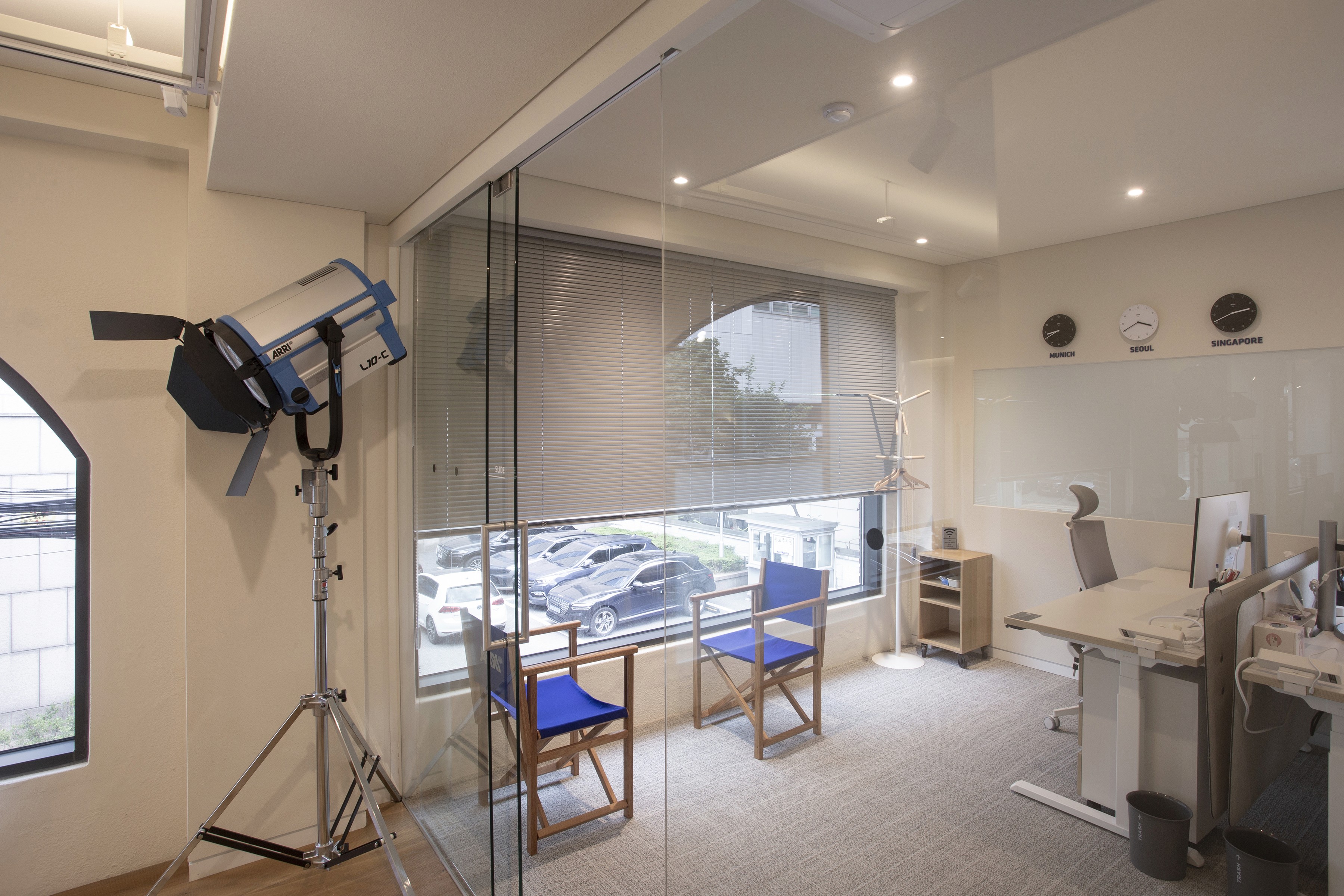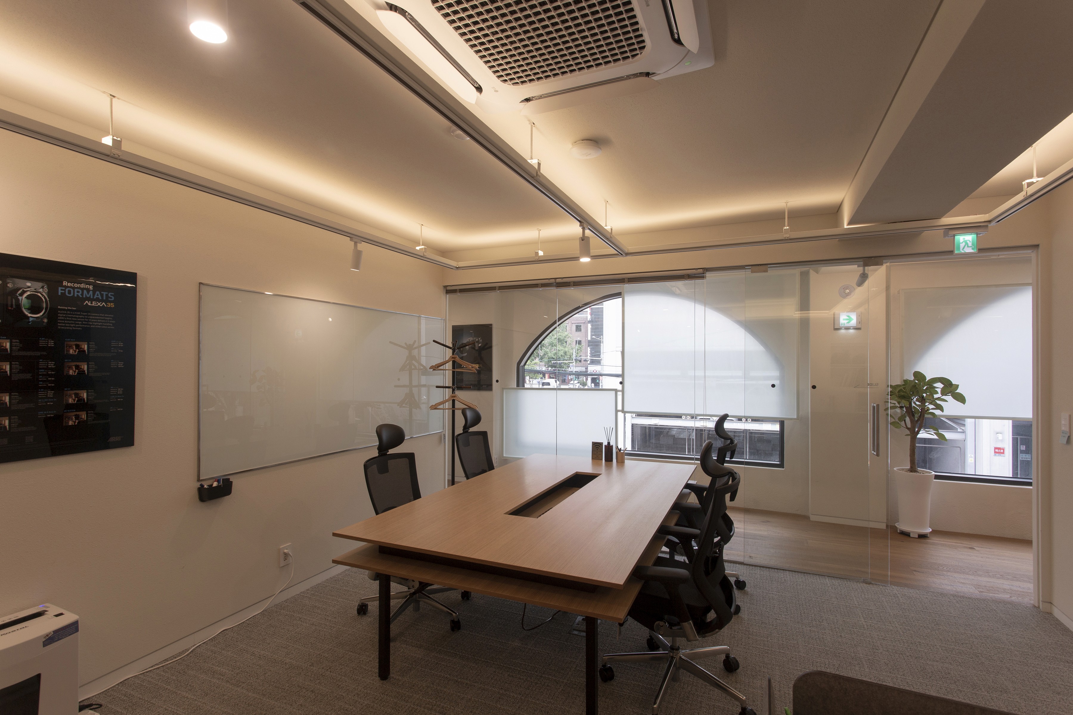 이러한 ARRI의 정체성과 비전이 공간에서도 드러나도록 디자인했다. 복도에 연속되는 아치 형태의 창 너머 풍경 위로 반투명한 사각 유리 프레임을 중첩해 새로운 이미지를 만들었다. 프레임은 ARRI가 만들어내는 이미지를 투영할 수 있는 스크린이 되며, 복도를 걸으며 마주하는 창의 반복을 하나의 시퀀스로 인식하도록 연출했다. 그 결과, 이동 자체가 새로운 이야기를 경험하는 장면이 되도록 했다.