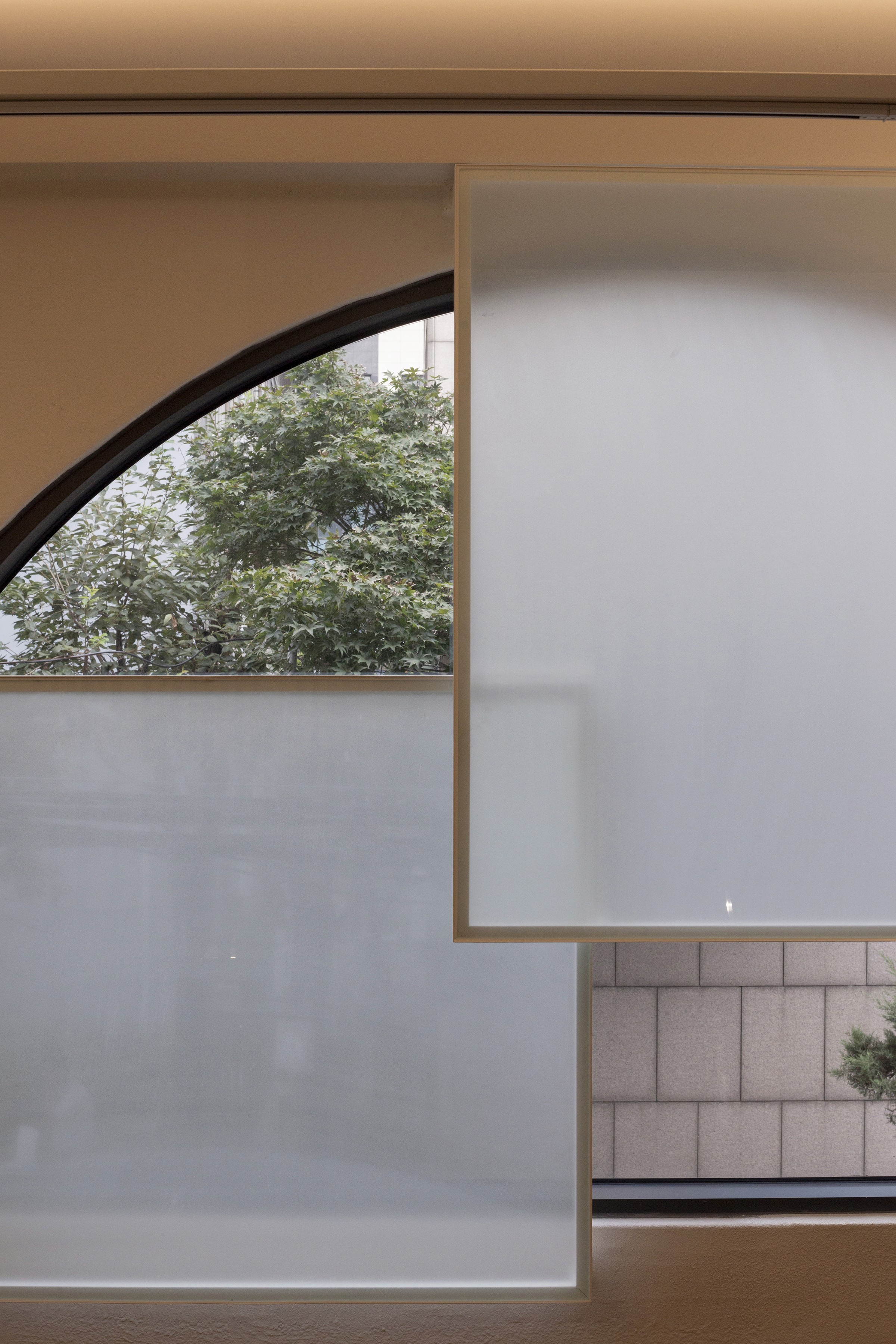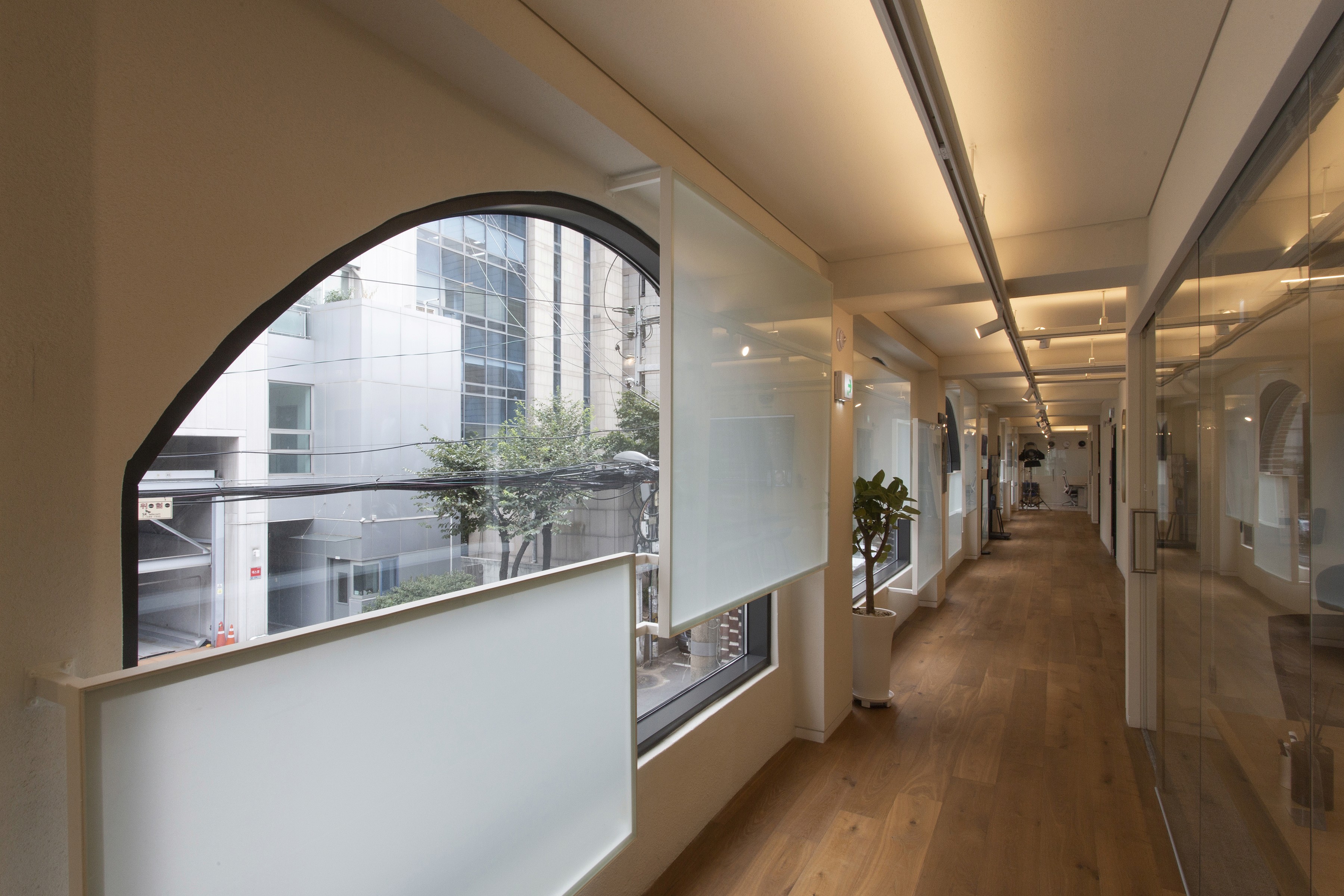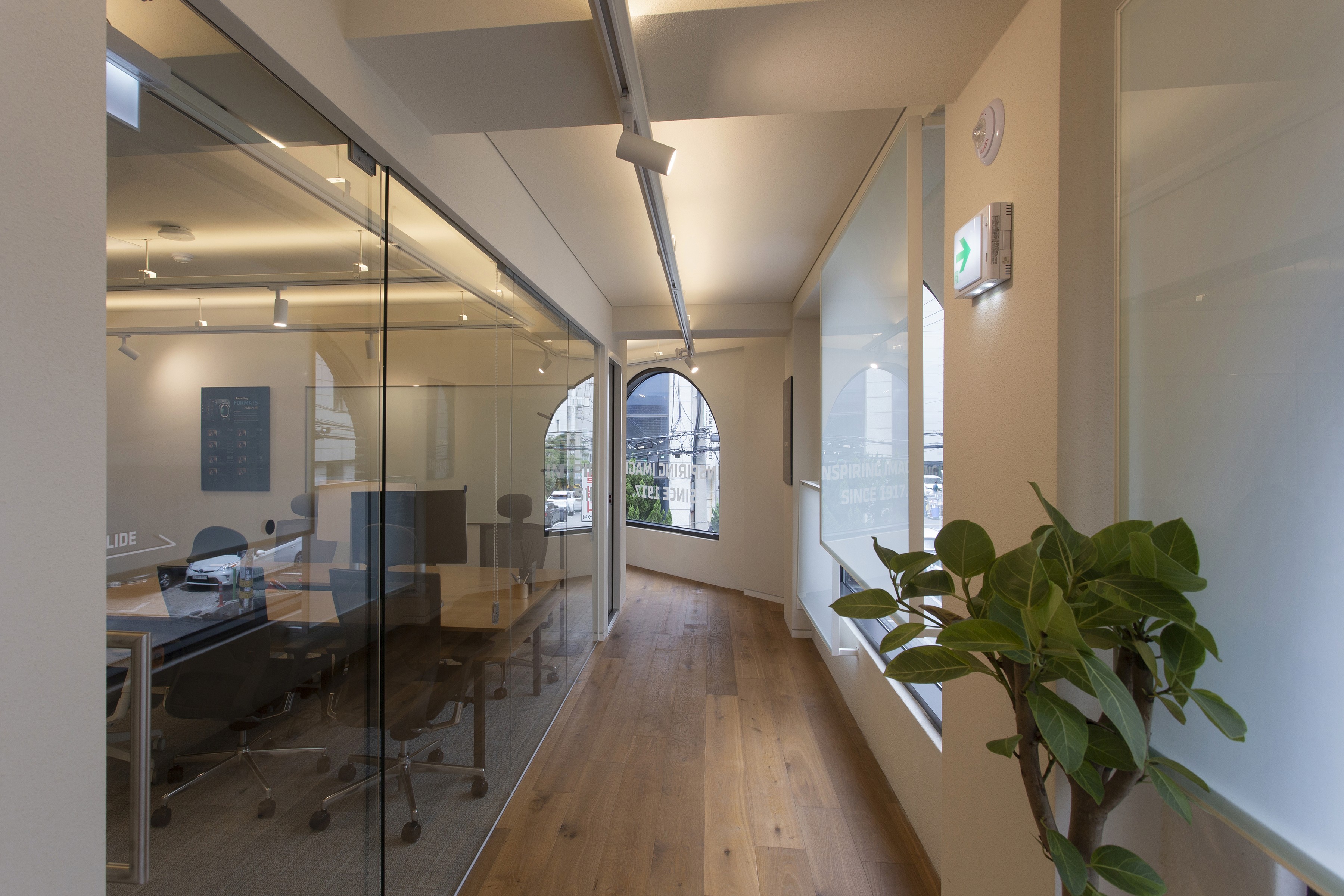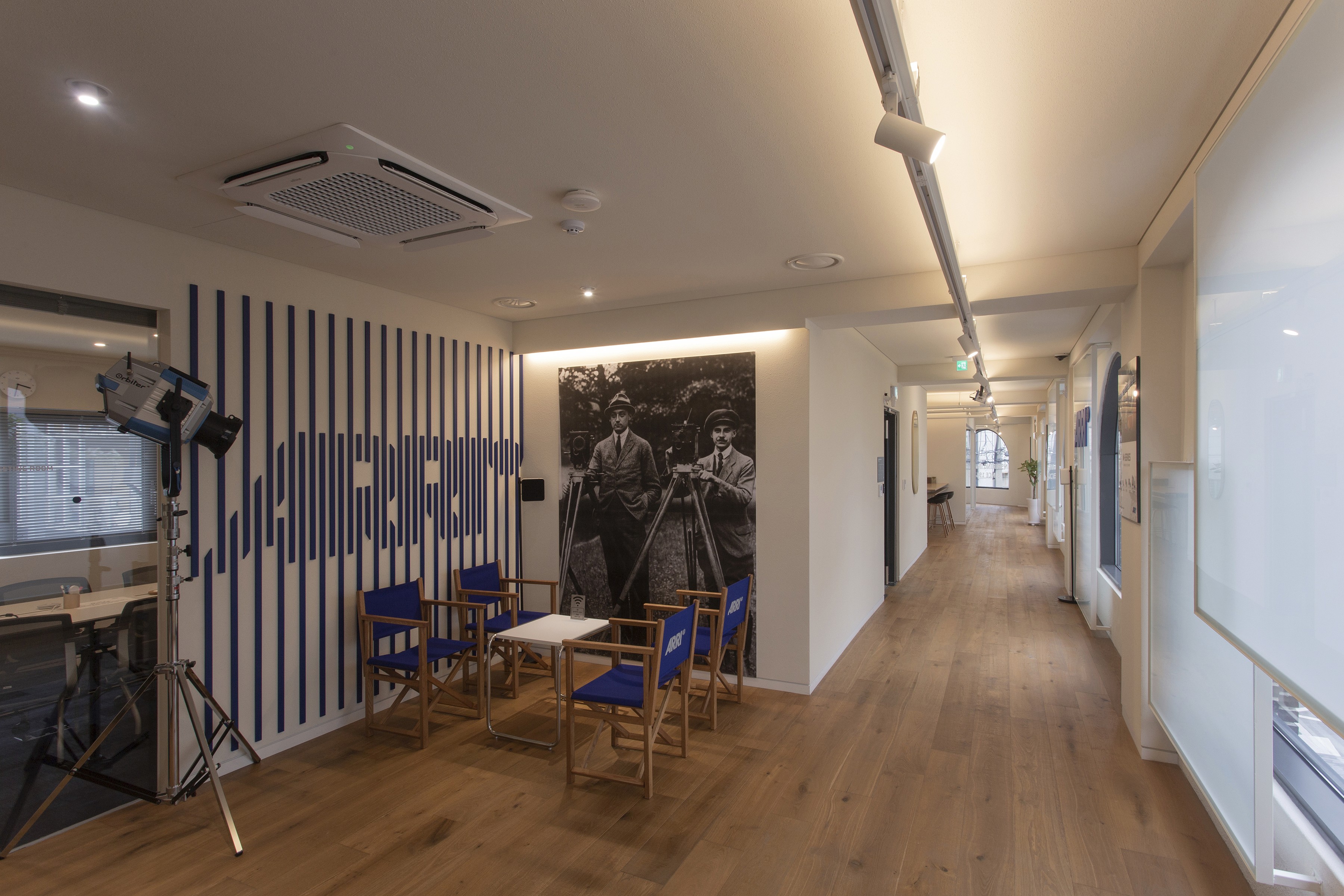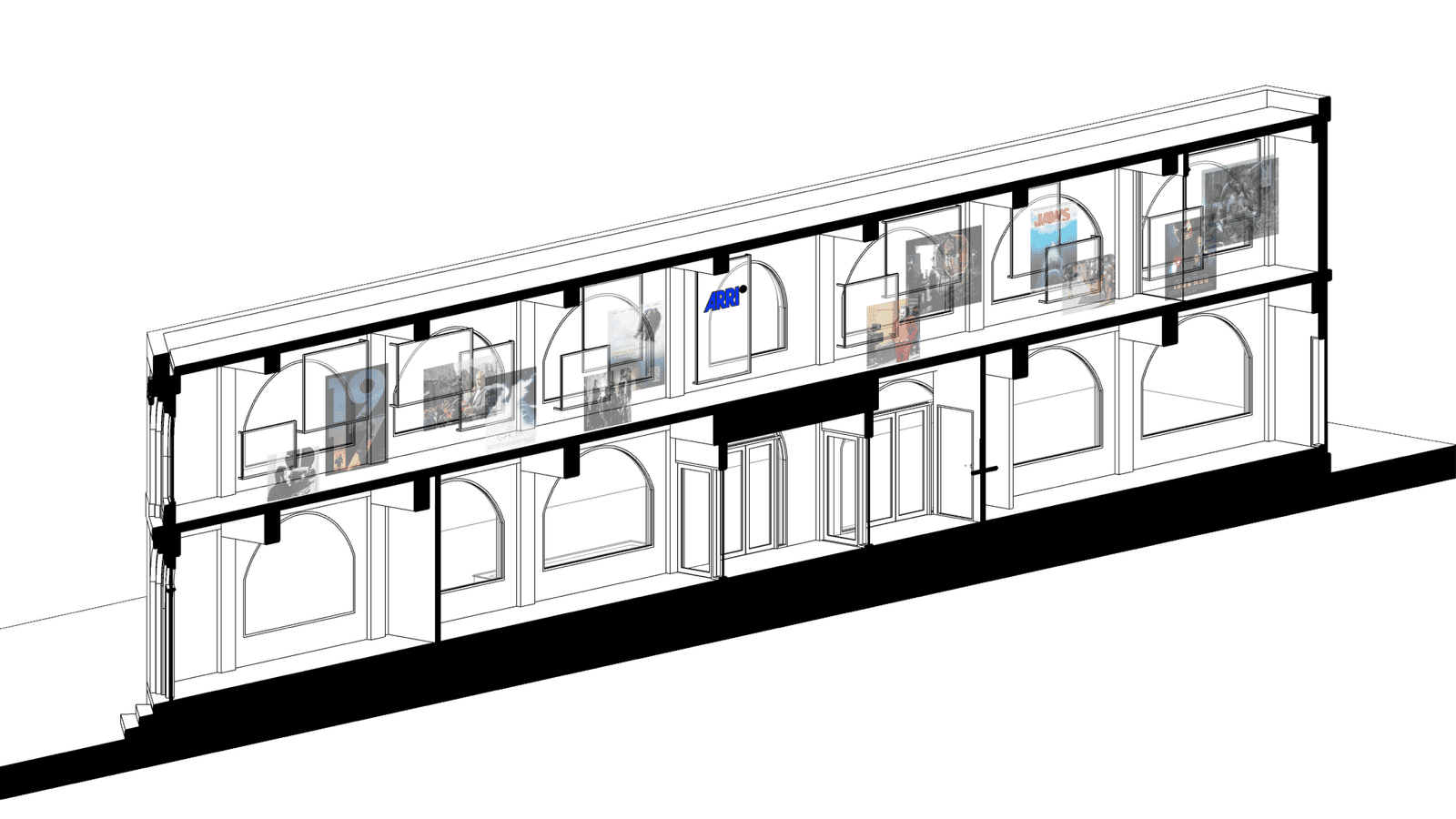 The space was designed to reflect ARRI’s identity and vision. Along the corridor, translucent rectangular glass frames are layered over the exterior view seen through a series of arched windows, creating new images. These frames also serve as projection surfaces for ARRI’s work. By treating the repeated windows encountered while walking down the corridor as a sequence, the design stages movement itself as a narrative experience.