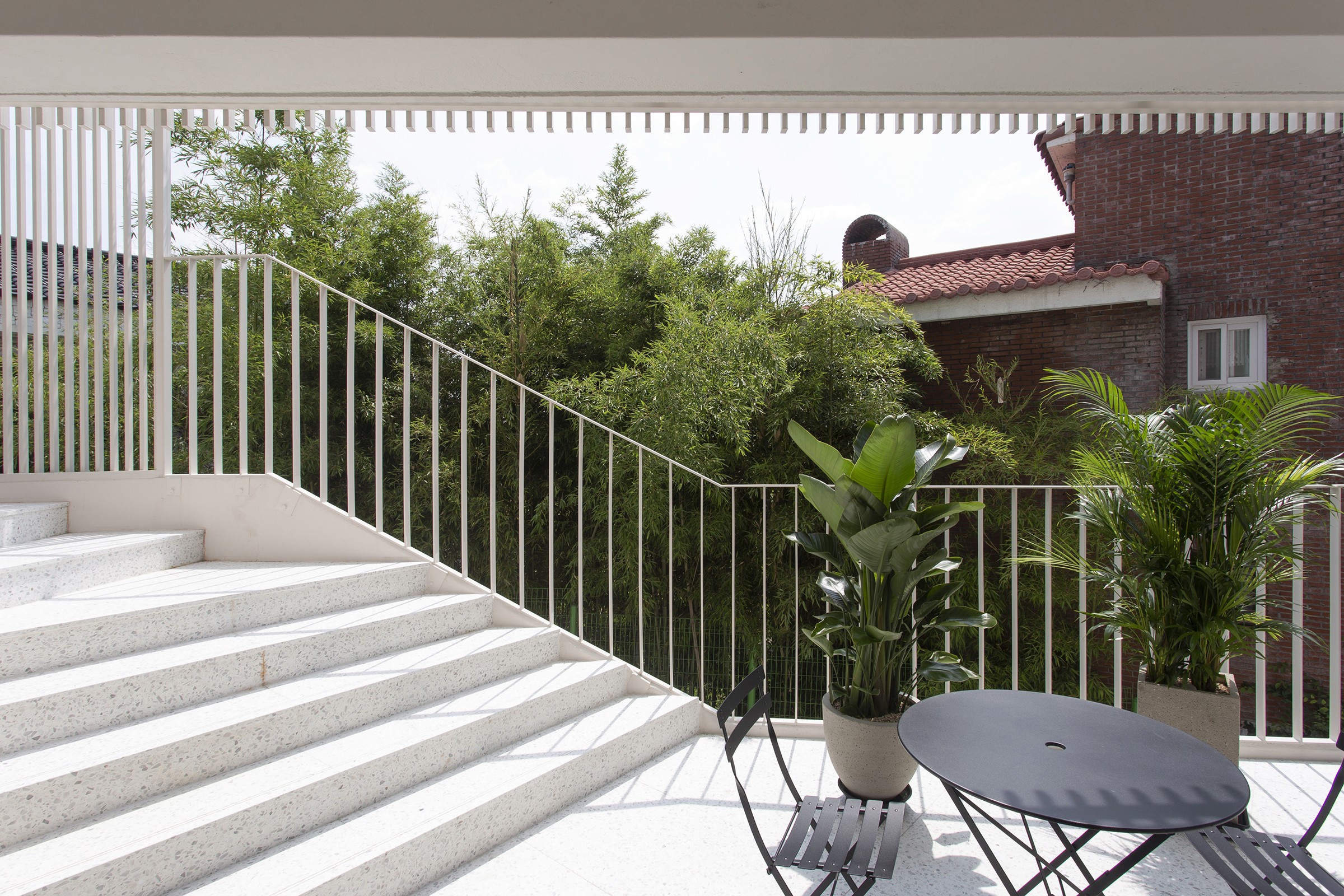 The central entrance is opened generously for easy access, while louvers along the perimeter shape the façade so the massing can be clearly perceived. On the rear façade, a frame was created to capture the adjacent bamboo grove like a picture. The entry stair is planned as two converging flights that lead into a terrace at the gallery entrance. Inside, the gallery is organized into an art shop, exhibition space, and office, with the office connecting through to the rear terrace. On the Level 1 deck, the louver height was adjusted to maintain openness and allow seated visitors to enjoy views of the surrounding landscape.