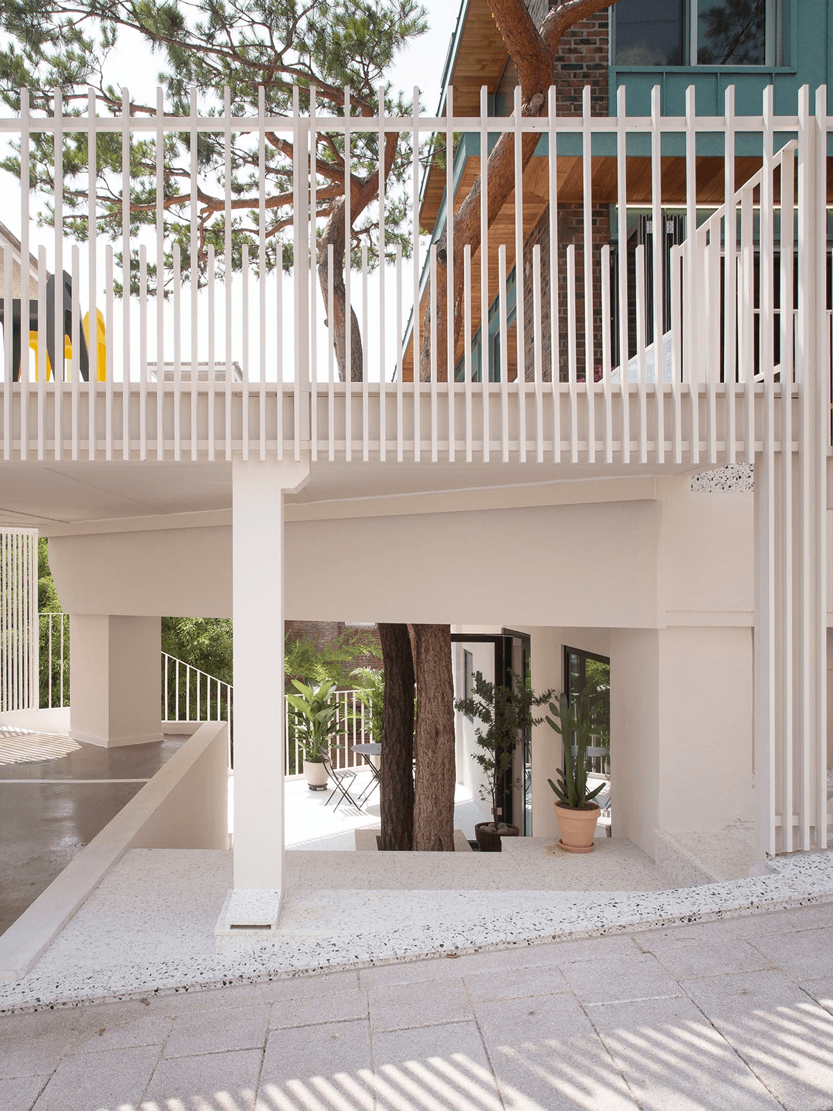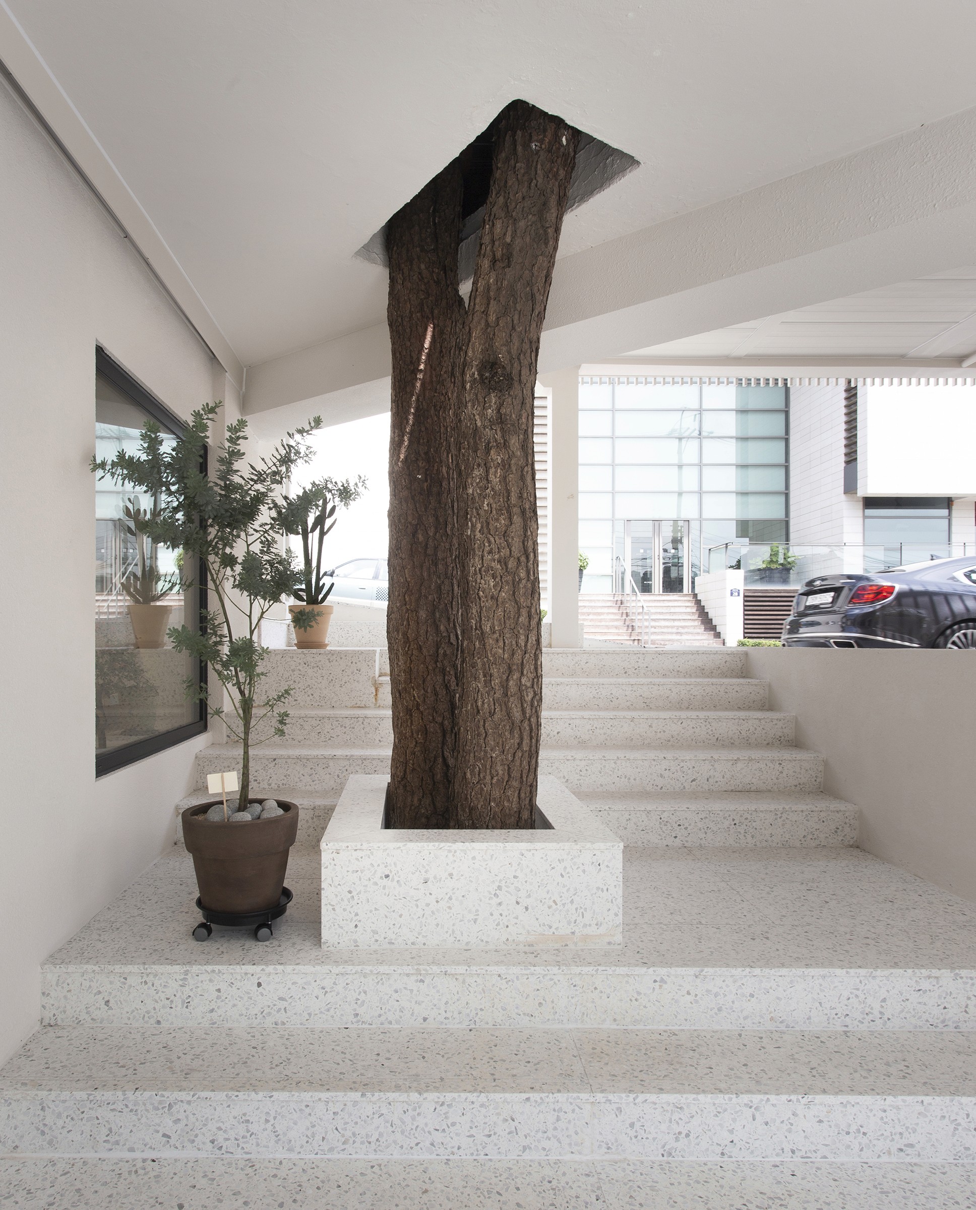 D. SPACE는 대지 내부의 소나무를 그대로 살려 건축물을 배치했는데, 데크를 뚫고 서 있는 소나무의 모습이 인상적이다. 조형예술을 전시하는 갤러리의 정체성을 드러내는 ‘Mass’라는 이름을 모티브로, 데크와 테라스가 단순한 ‘판’이 아니라 하나의 Mass로 인식되도록 구성하되 주변 조망을 해치지 않도록 조율했다. 수직 루버 너머로 겹쳐 보이는 자연 풍경을 통해, 금속 루버의 물성보다 비물질적인 이미지가 먼저 읽히도록 계획했다.