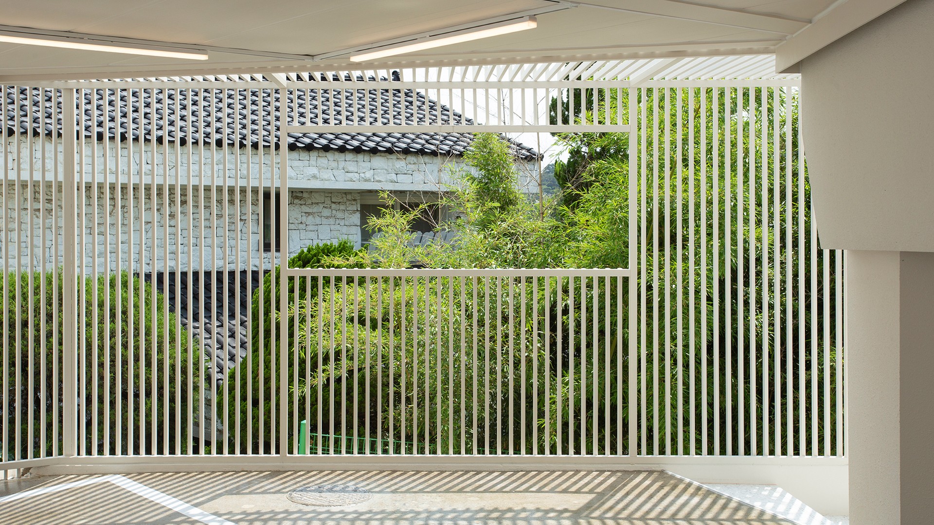 D. SPACE was originally placed to preserve an existing pine tree on site, and the sight of the tree rising through the deck is particularly striking. Taking the gallery’s name, “Mass,” as a motif that reflects its identity as a space for sculptural art, the deck and terrace were composed to be read not as a flat plane but as a mass—carefully calibrated so the surrounding views remain unobstructed. Through the natural scenery layered beyond the vertical louvers, the overall perception shifts from the materiality of metal to a more immaterial image.