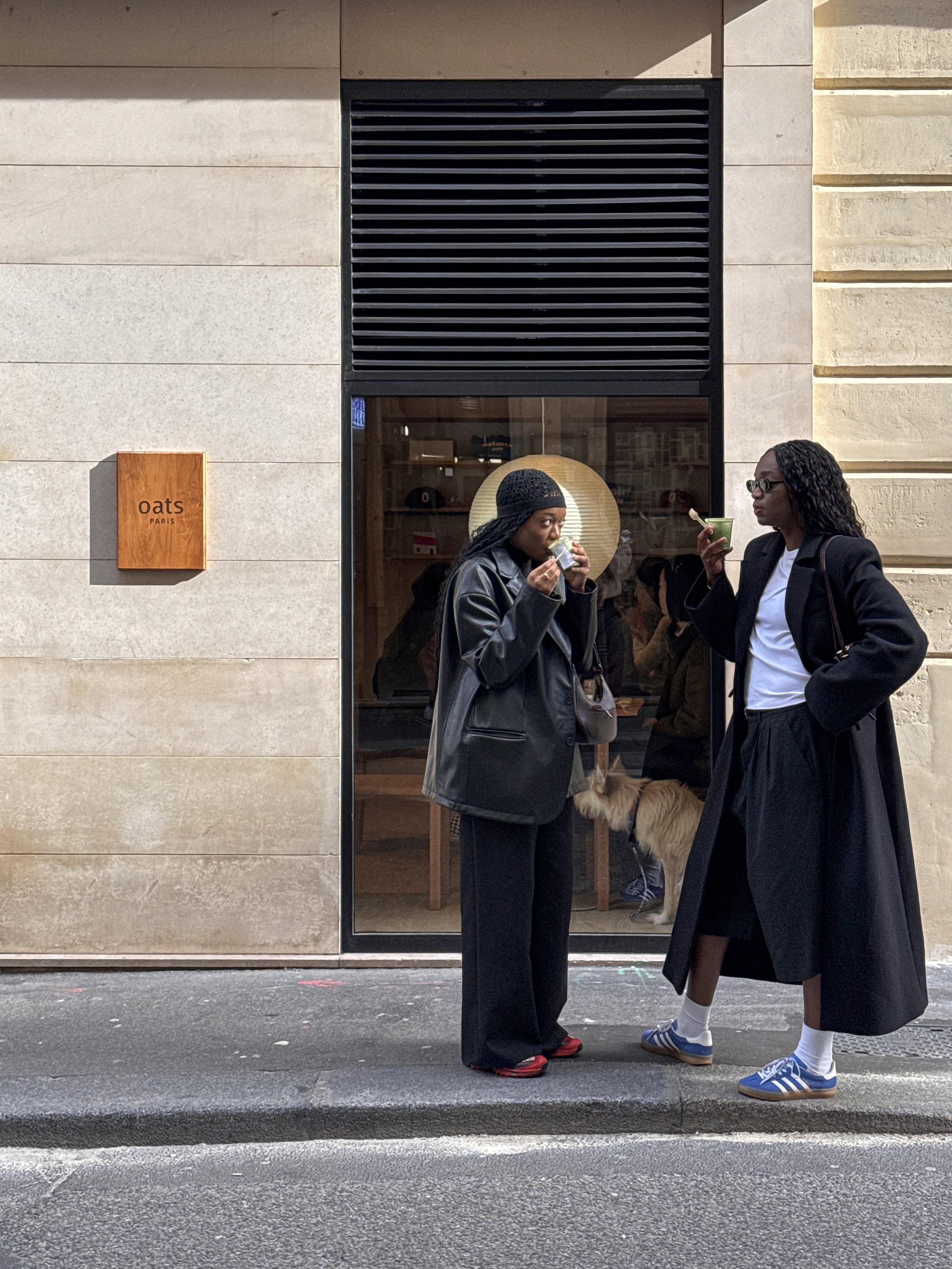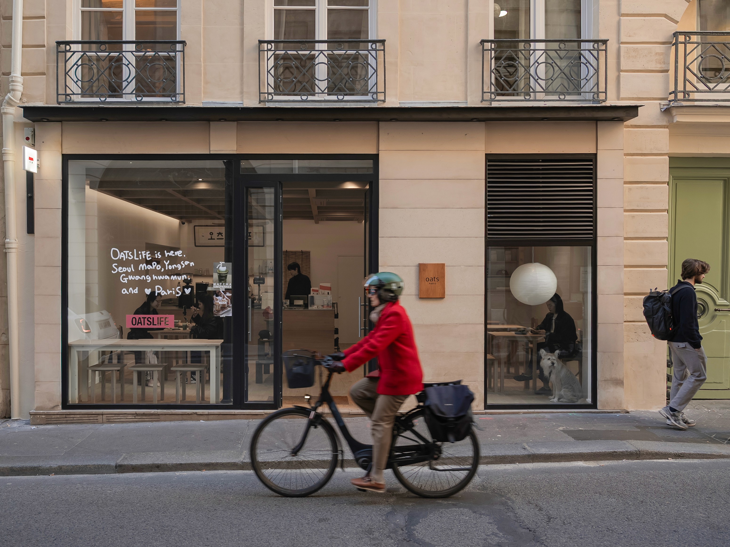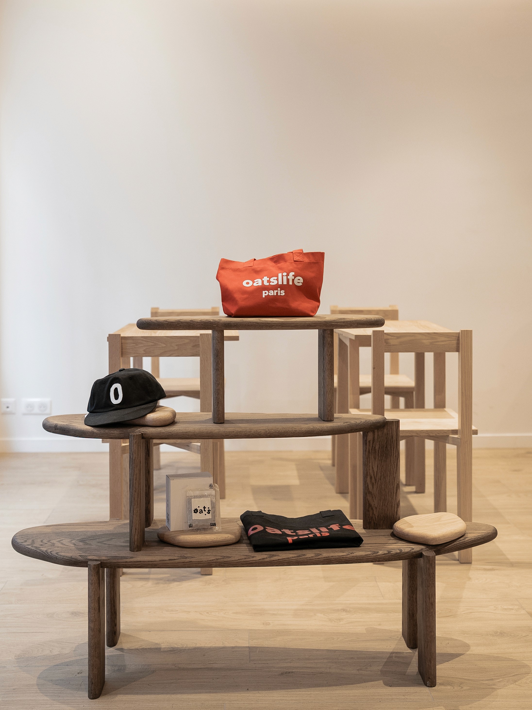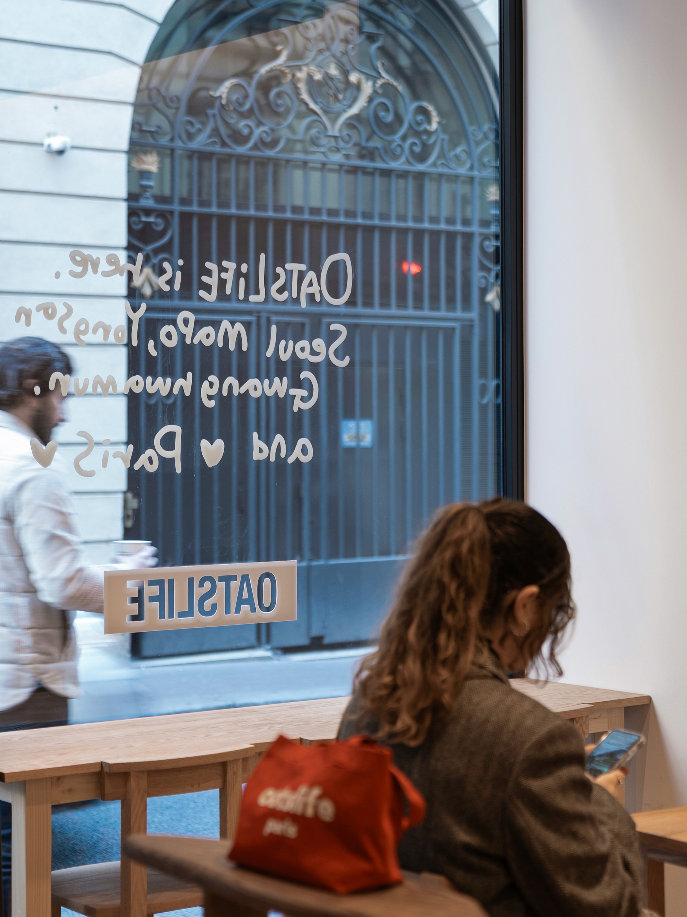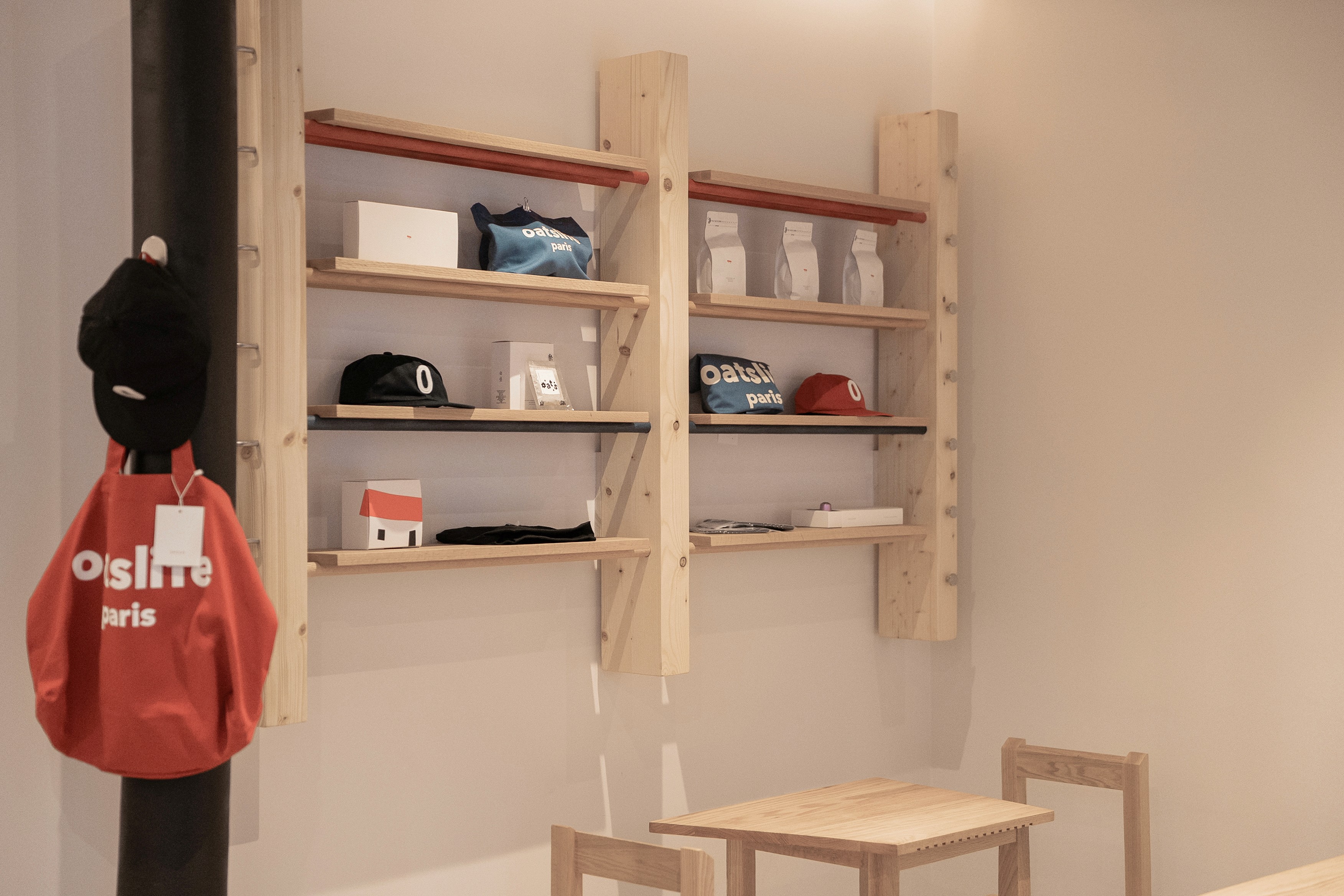 Oats Coffee’s first store in Paris—less a coffee brand than a lifestyle brand—was about how to place the elements they already had in a way that felt right for the local context. There are a few recurring elements in Oats’ spaces: white and off-white tones, wood and paper, a grid, the shop sign—and, above all, the people mingling out front. To call Oats a lifestyle brand is to say that what they make isn’t the product itself, but a place where people mix and gather.