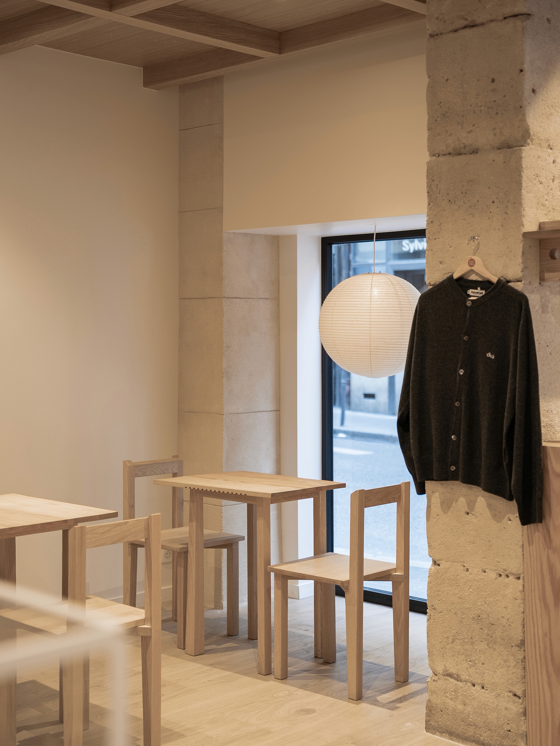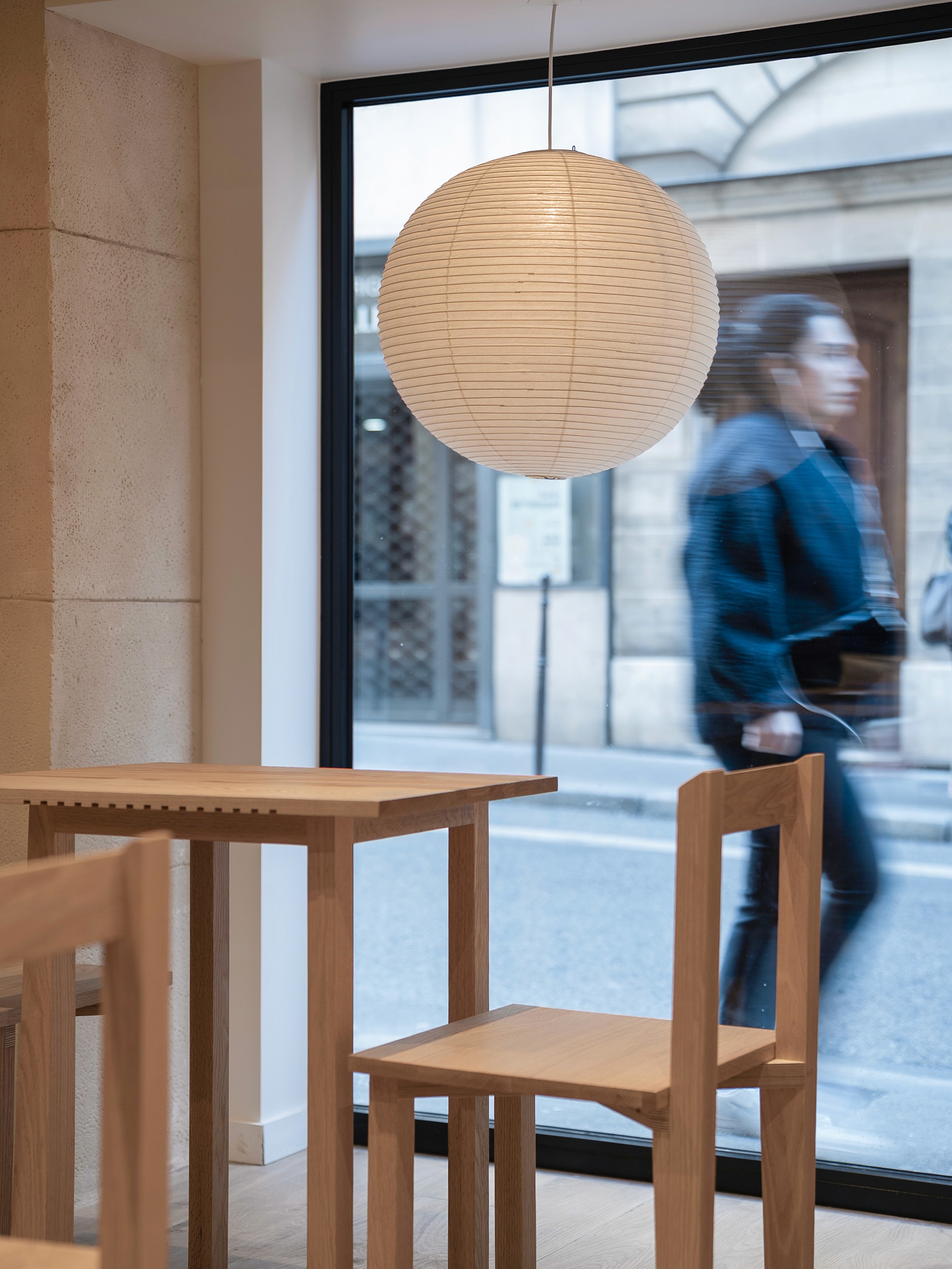 Oats Paris creates a structure in which interior and exterior communicate through a glass façade. A bar-style table and seating set to face the window, along with Isamu Noguchi’s Akari pendants hung by the glass like displays, shift the space’s center of gravity toward the street. There may be no generous forecourt, but this shift effectively turns Rue Sainte-Anne into the store’s front yard.