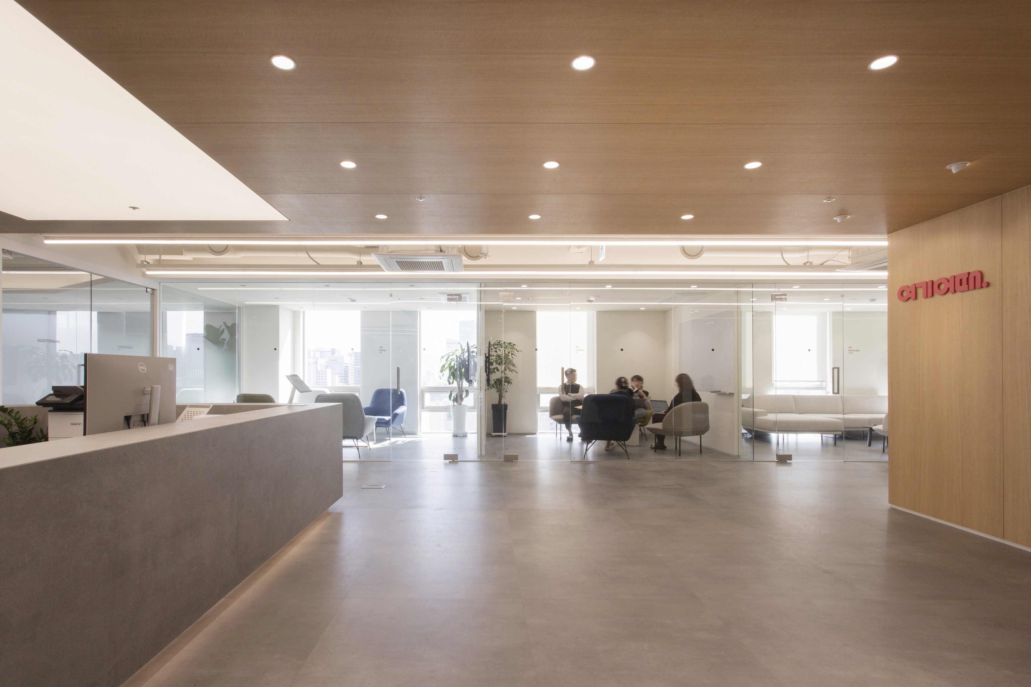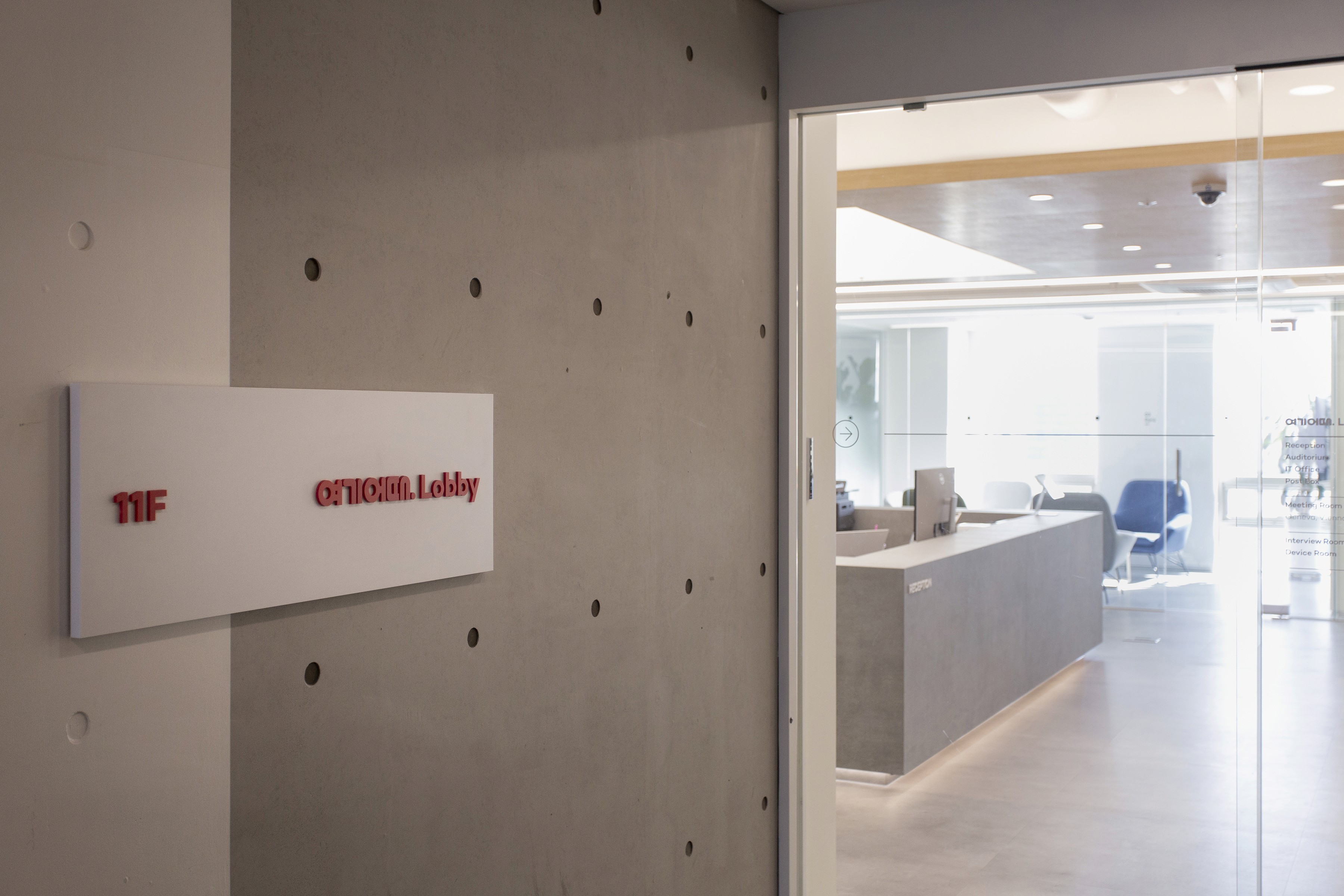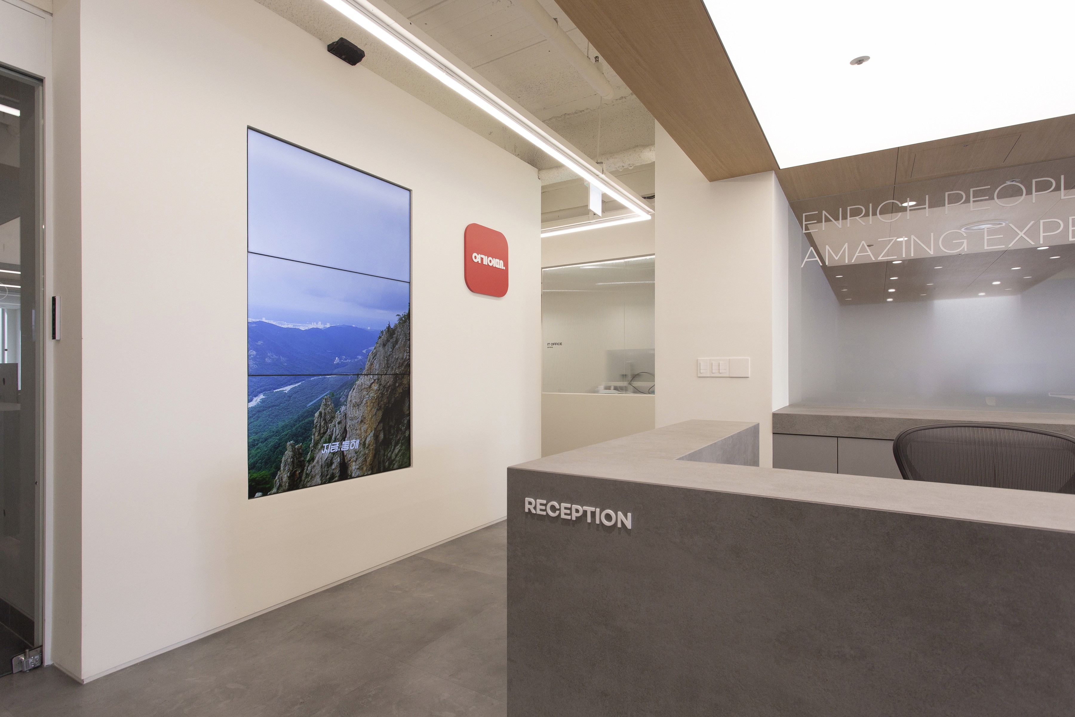 An office lobby is where a company’s first impression is formed. Since the Yeogi Eottae office occupies a mid-level floor of the building, the lounge plays a central role—serving both as an outward-facing lobby and as an internal hub that also accommodates meeting spaces for employees. For a startup that has grown into a unicorn, the key values are open communication and free collaboration without boundaries. To express this culture spatially, the project was planned around the concept of a seamlessly connected space. Zones are defined through transparency, and the idea is made tangible through a structural element that runs through and connects each area.