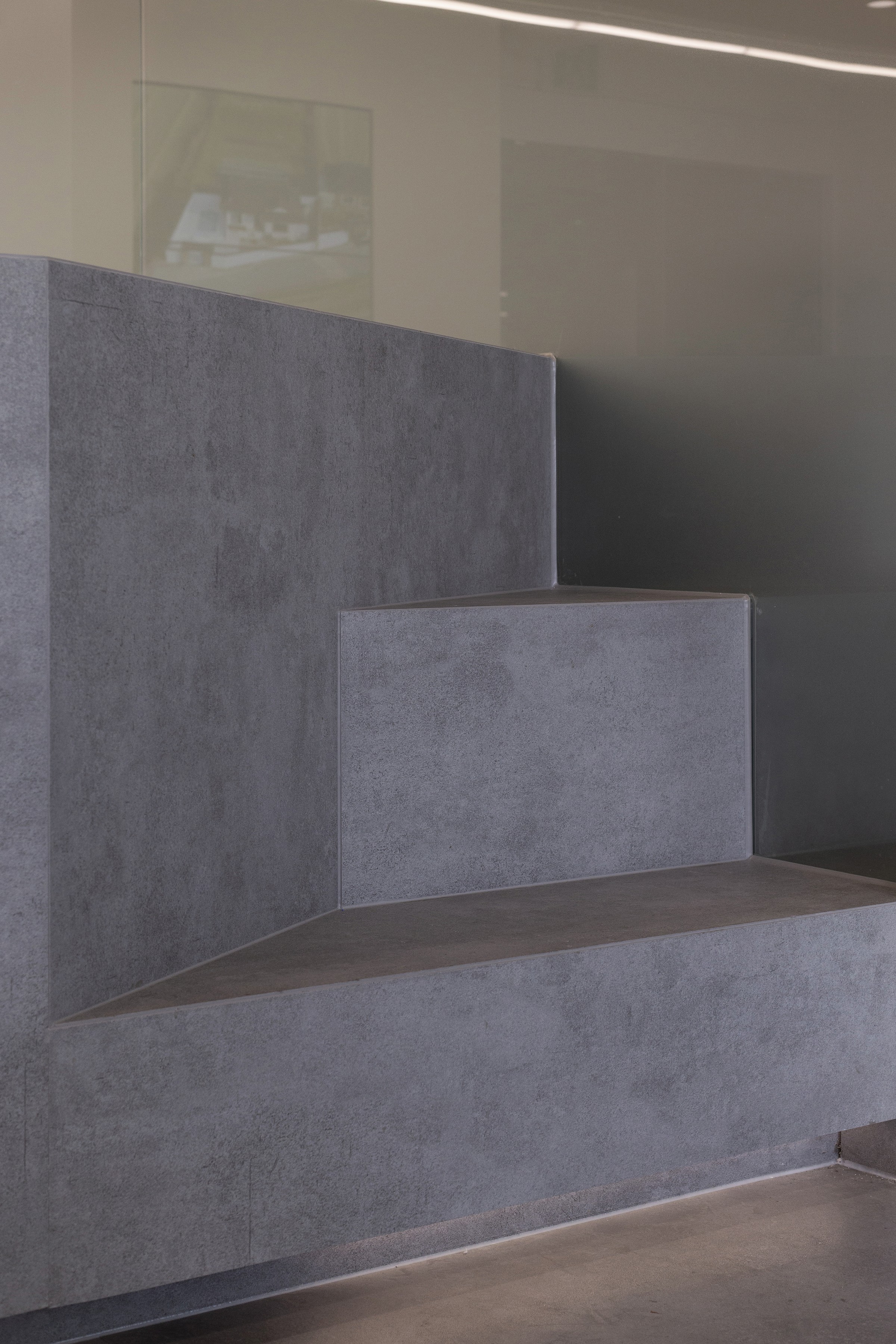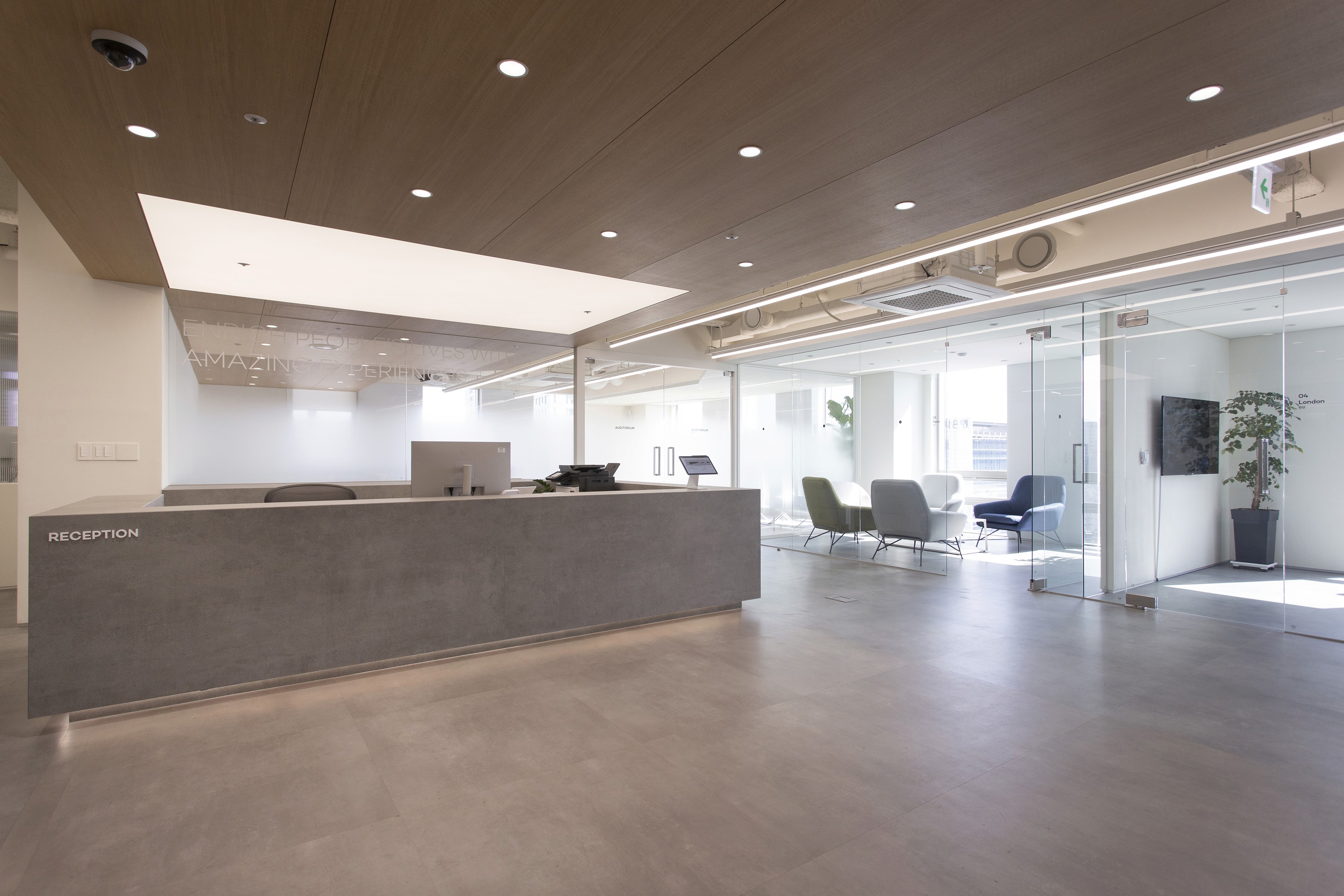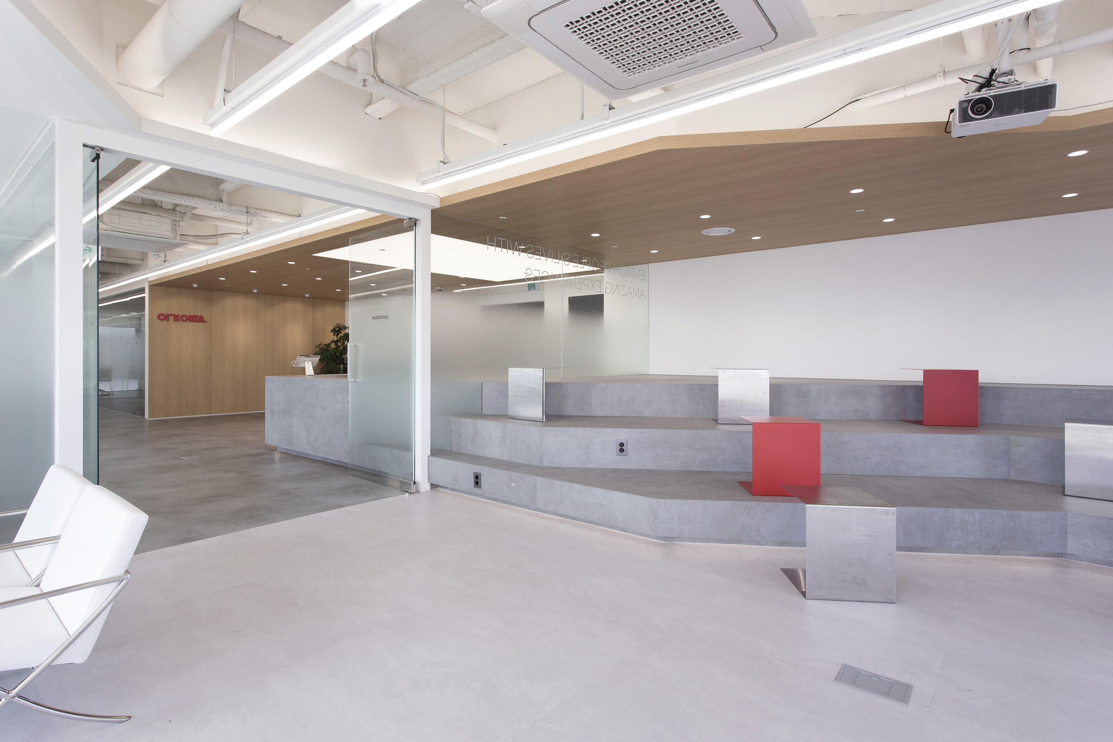 To ensure the spaces are experienced as a continuous sequence, four strategies were applied: (1) a spatially symmetrical structure, (2) consistent forms and materials, (3) a continuous material expression linking multiple surfaces, and (4) a single structural element that passes through multiple spaces. The stand-style steps of the small auditorium extend into the reception desk, while an overhead ceiling structure echoes the geometry of the stands and continues onto the wall—reinforcing the concept through a continuous gesture.